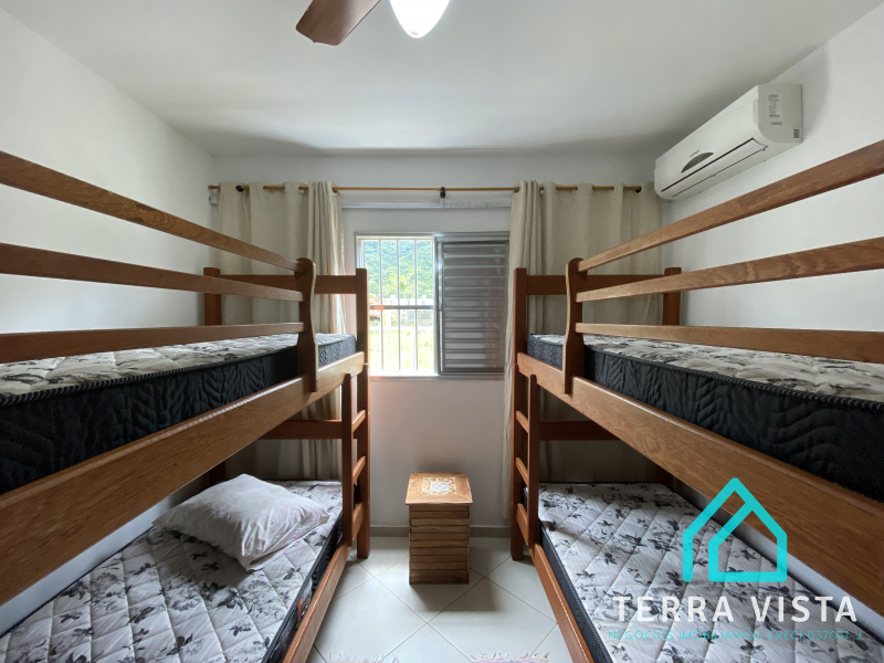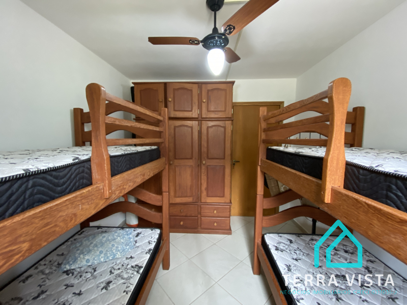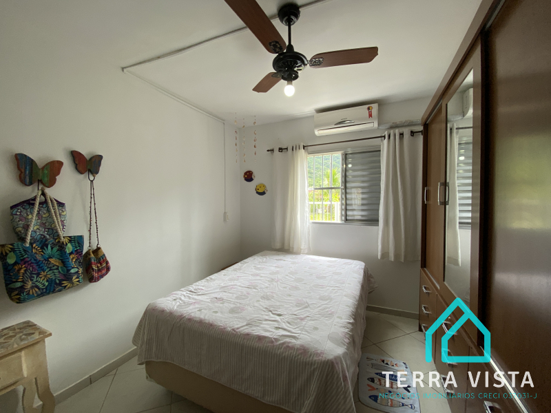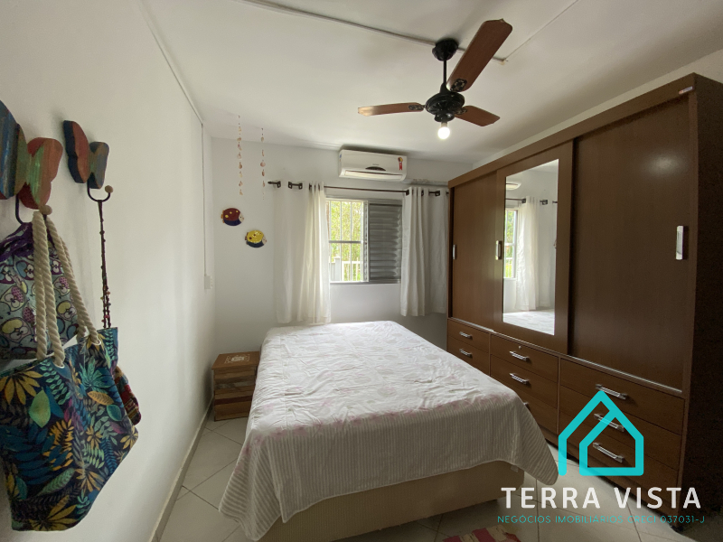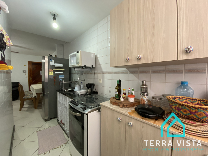 Apartamento à venda na Praia do Sapê, composto por 2 dormitórios sendo 1 suíte, sala com acesso à varanda, cozinha com móveis planejados e banheiro social.